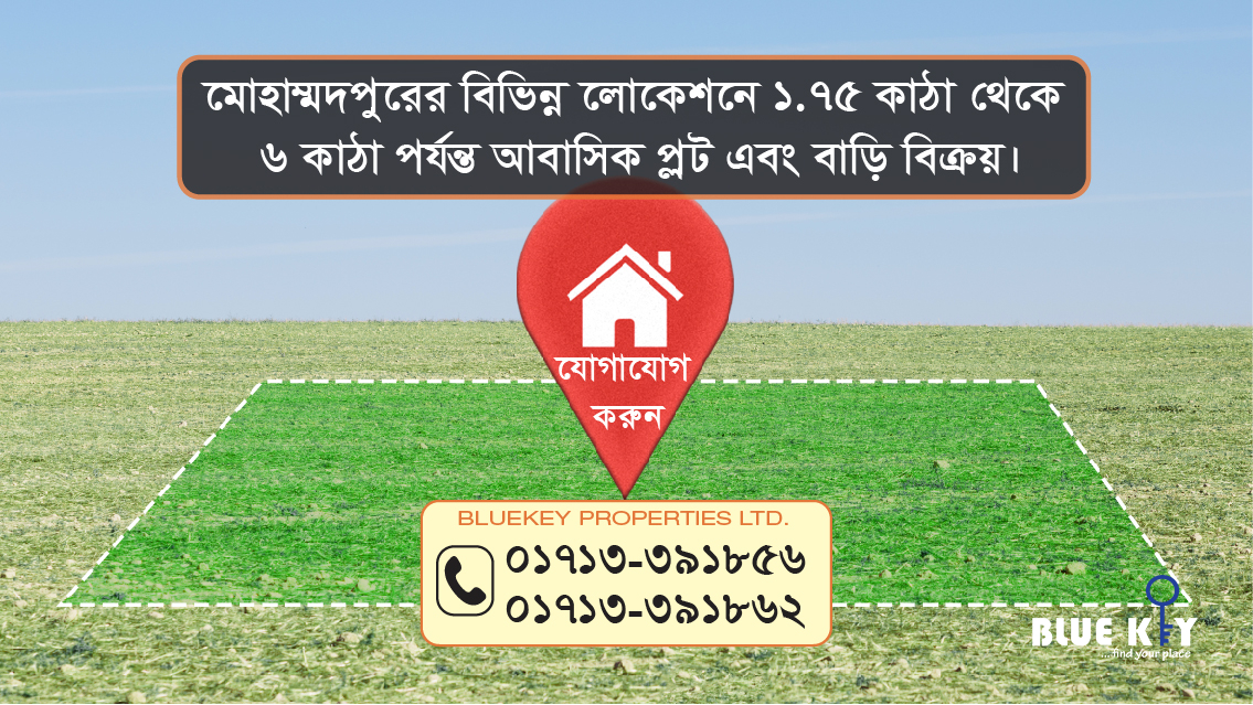 আধুনিক নাগরিক সুযোগ সুবিধা সংবলিত মোহাম্মদপুরের বিভিন্ন লোকেশনে ১.৭৫ কাঠা থেকে ৬ কাঠা পর্যন্ত আবাসিক প্লট এবং বাড়ি বিক্রয়।